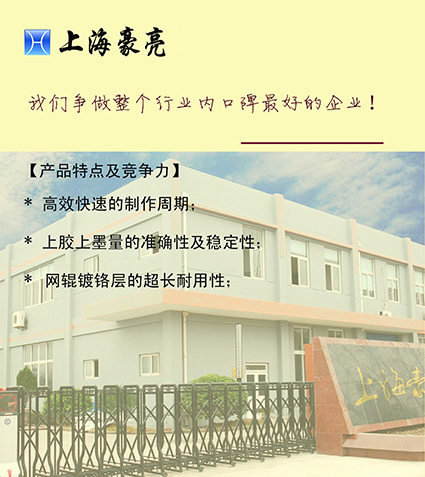 发布时间:2024-08-16 点击次数:1092上海豪亮机械有限公司是一家专业制造金属网纹辊、镀铬辊、压花辊、镜面辊等各种辊筒的专业制辊企业,产品广泛用于印刷、包装、塑胶、皮革、薄膜、胶黏制品、纸张以及各种柔性版印刷机械等行业。